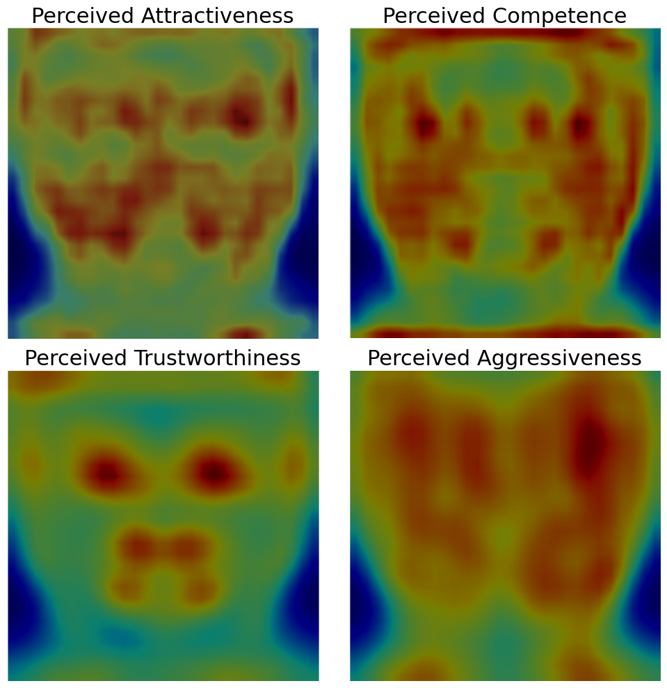 The figures below illustrates the contributions of different facial regions to the machine-based ratings of the four facial traits. The facial heat maps are produced by Gradient-weighted Class Activation Mapping (Grad-CAM), a visualization technique for interpreting deep-learning models. Regions highlighted in red indicate significant contributions to the prediction of the trait, while blue regions indicate minimal contributions.