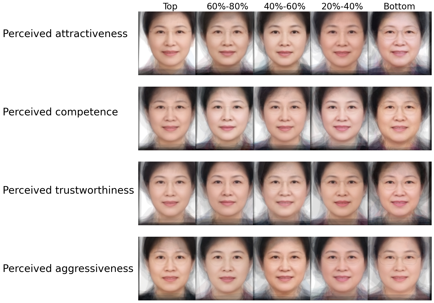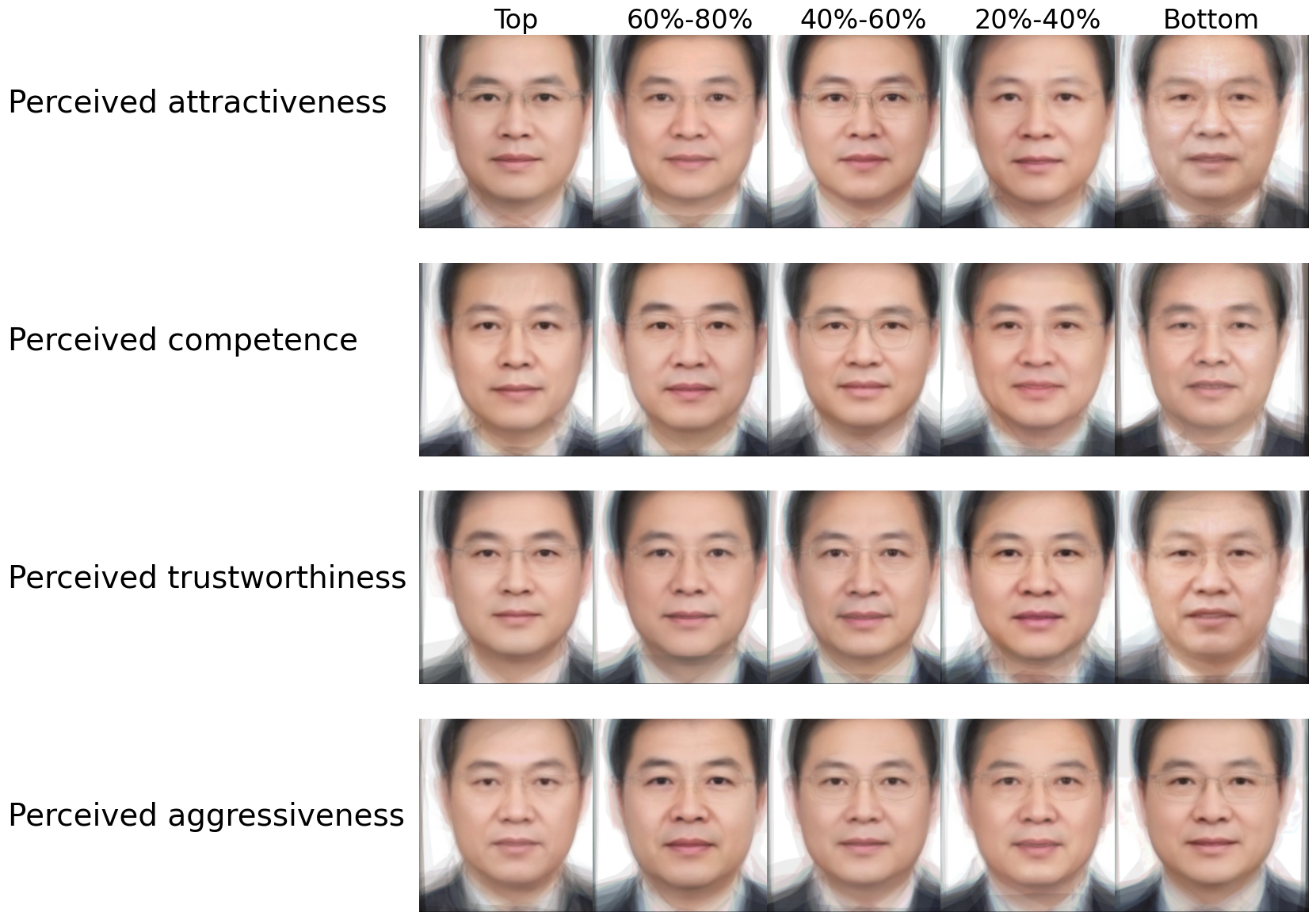 The figures below visualize how perceived facial traits correlate with elite political advancement in China. Officials are grouped by percentile rankings of machine-estimated facial traits. Synthetic “average faces” are generated within each percentile group to illustrate systematic perceptual variation associated with career outcomes.